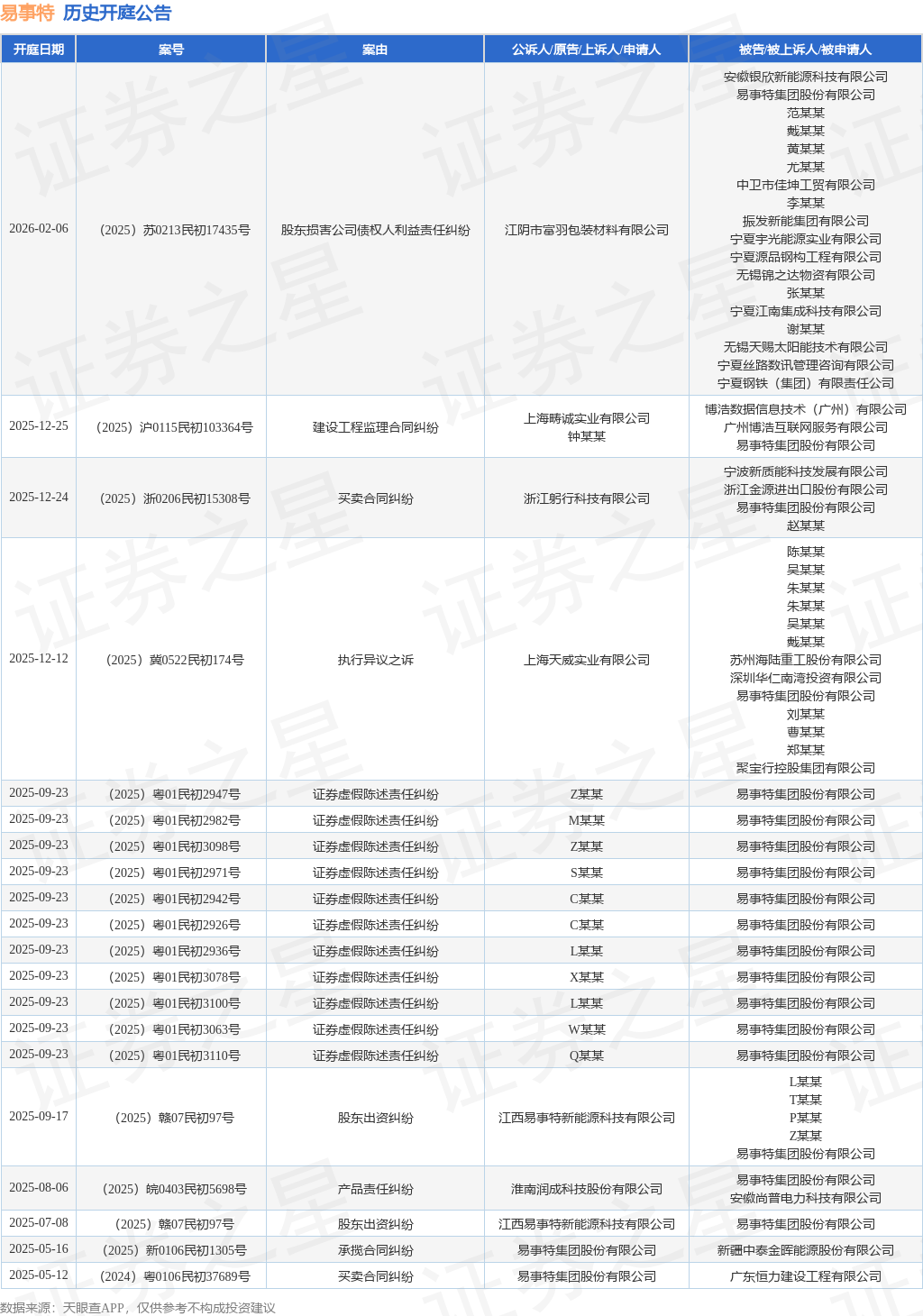 案号:(2025)苏0213民初17435号根据统计,近一年内以易事特集团股份有限公司为当事人的历史开庭公告有24则,其中案由为“证券虚假陈述责任纠纷”的公告以12则居首,其次为“买卖合同纠纷”有4则,“承揽合同纠纷”有2则。历史开庭公告(前20条)如下:
