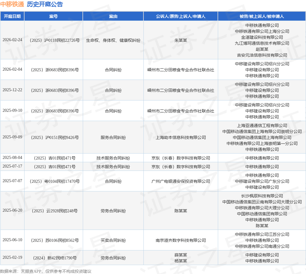 根据统计,近一年内以中移铁通有限公司为当事人的历史开庭公告有11则,其中案由为“合同纠纷”的公告以4则居首,其次为“劳务合同纠纷”有2则,“技术服务合同纠纷”有2则。历史开庭公告如下: