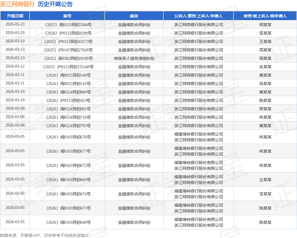 案号:(2026)闽0721民初135号根据统计,近一年内以浙江网商银行股份有限公司为当事人的历史开庭公告有933则,其中案由为“金融借款合同纠纷”的公告以852则居首,其次为“借款合同纠纷”有37则,“小额借款合同纠纷”有10则。历史开庭公告(前20条)如下: