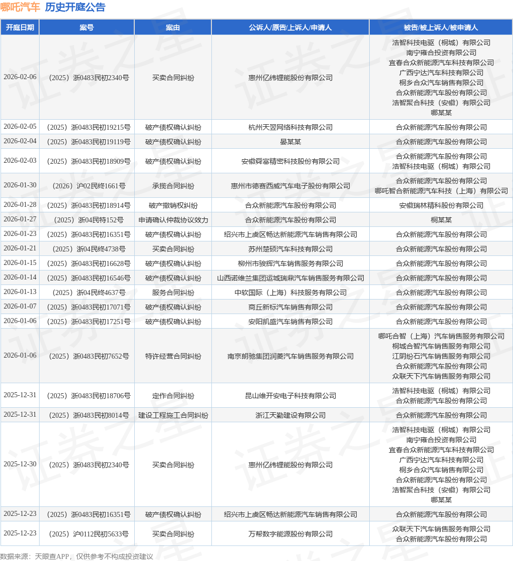 案号:(2025)浙0483民初2340号根据统计,近一年内以合众新能源汽车股份有限公司为当事人的历史开庭公告有403则,其中案由为“买卖合同纠纷”的公告以152则居首,其次为“服务合同纠纷”有49则,“合同纠纷”有48则。历史开庭公告(前20条)如下: