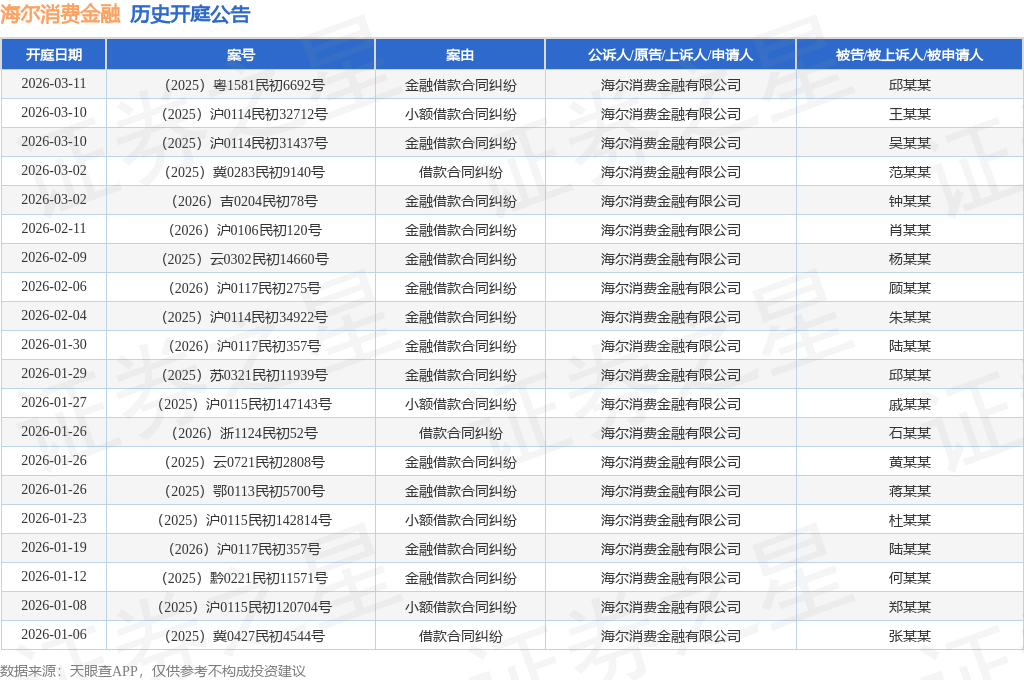 案号:(2026)沪0117民初275号根据统计,近一年内以海尔消费金融有限公司为当事人的历史开庭公告有369则,其中案由为“金融借款合同纠纷”的公告以266则居首,其次为“借款合同纠纷”有57则,“小额借款合同纠纷”有31则。历史开庭公告(前20条)如下: