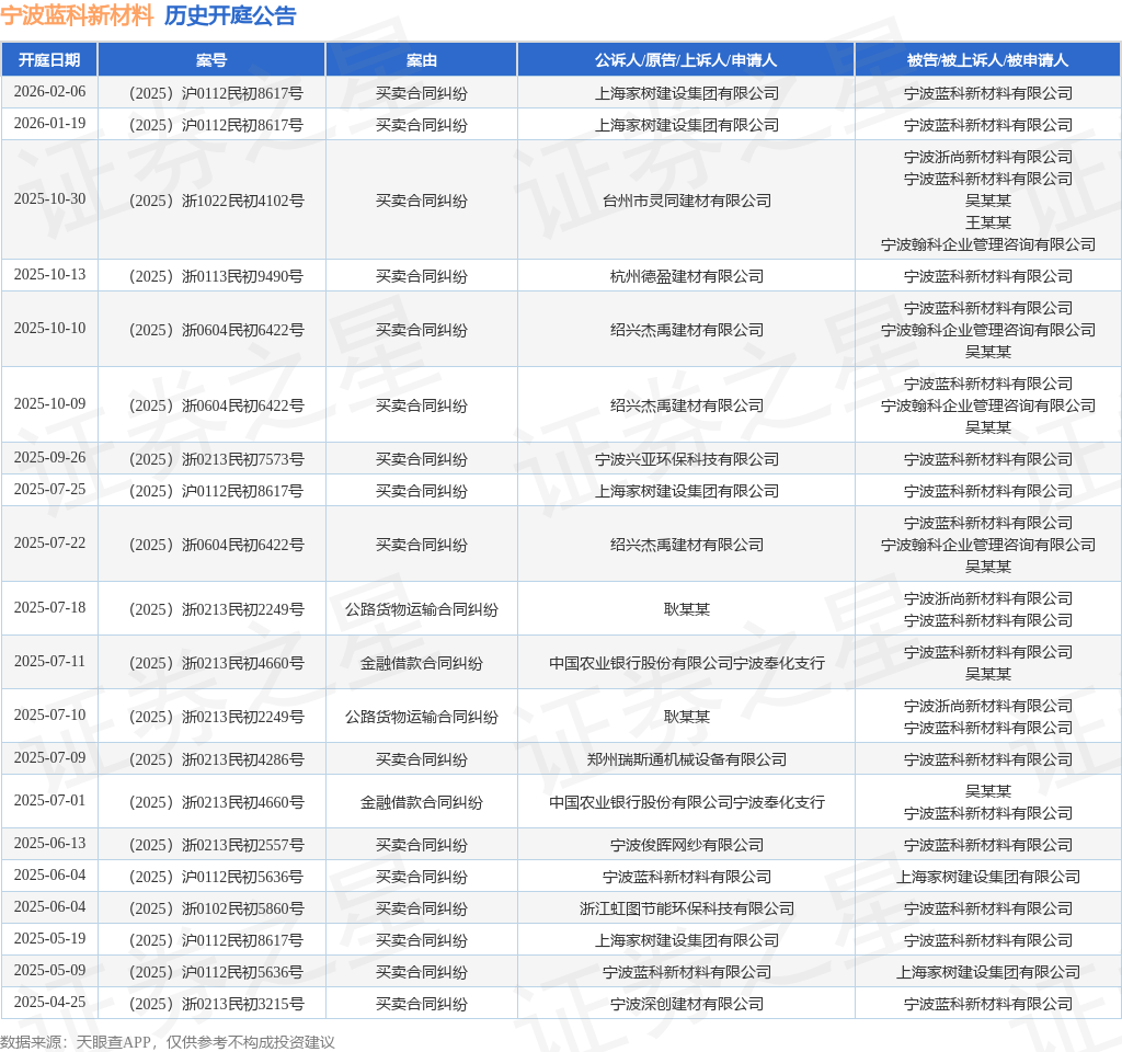 案号:(2025)沪0112民初8617号根据统计,近一年内以宁波蓝科新材料有限公司为当事人的历史开庭公告有21则,其中案由为“买卖合同纠纷”的公告以17则居首,其次为“公路货物运输合同纠纷”有2则,“金融借款合同纠纷”有2则。历史开庭公告(前20条)如下: