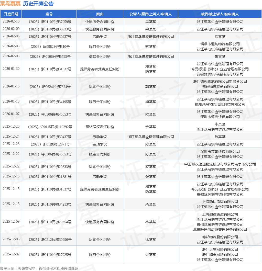 案号:(2025)浙0110民初30437号根据统计,近一年内以浙江菜鸟供应链管理有限公司为当事人的历史开庭公告有73则,其中案由为“快递服务合同纠纷”的公告以27则居首,其次为“劳动争议”有13则,“服务合同纠纷”有7则。历史开庭公告(前20条)如下:
