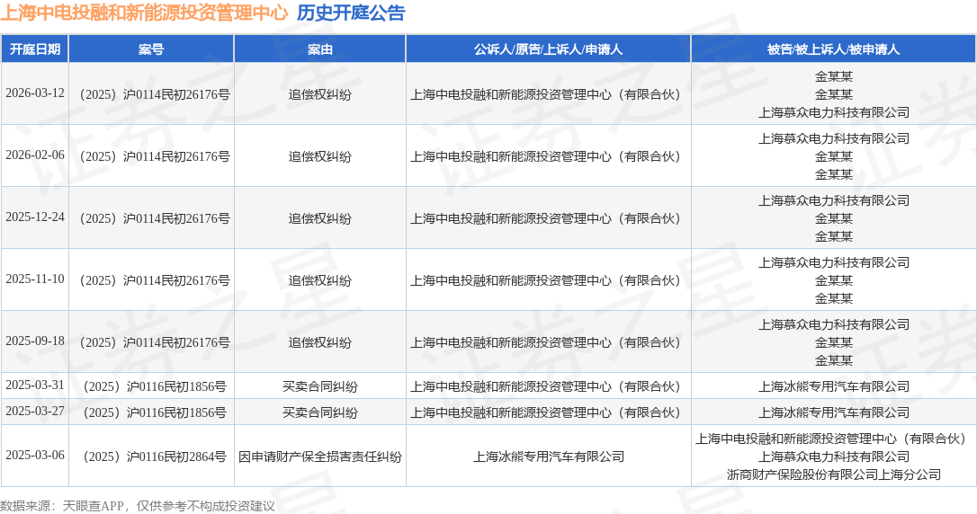 案号:(2025)沪0114民初26176号根据统计,近一年内以上海中电投融和新能源投资管理中心(有限合伙)为当事人的历史开庭公告有8则,其中案由为“追偿权纠纷”的公告以5则居首,其次为“买卖合同纠纷”有2则,“因申请财产保全损害责任纠纷”有1则。历史开庭公告如下: