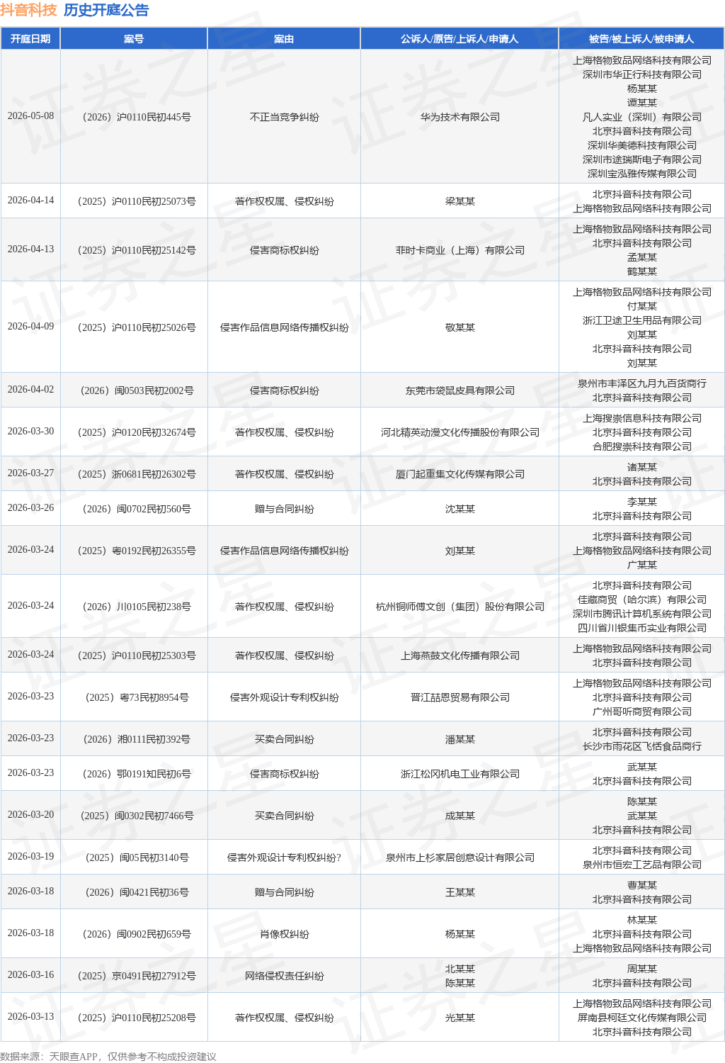 案号:(2025)浙0113民初18178号根据统计,近一年内以北京抖音科技有限公司为当事人的历史开庭公告有1615则,其中案由为“侵害商标权纠纷”的公告以203则居首,其次为“侵害外观设计专利权纠纷”有186则,“名誉权纠纷”有162则。历史开庭公告(前20条)如下: