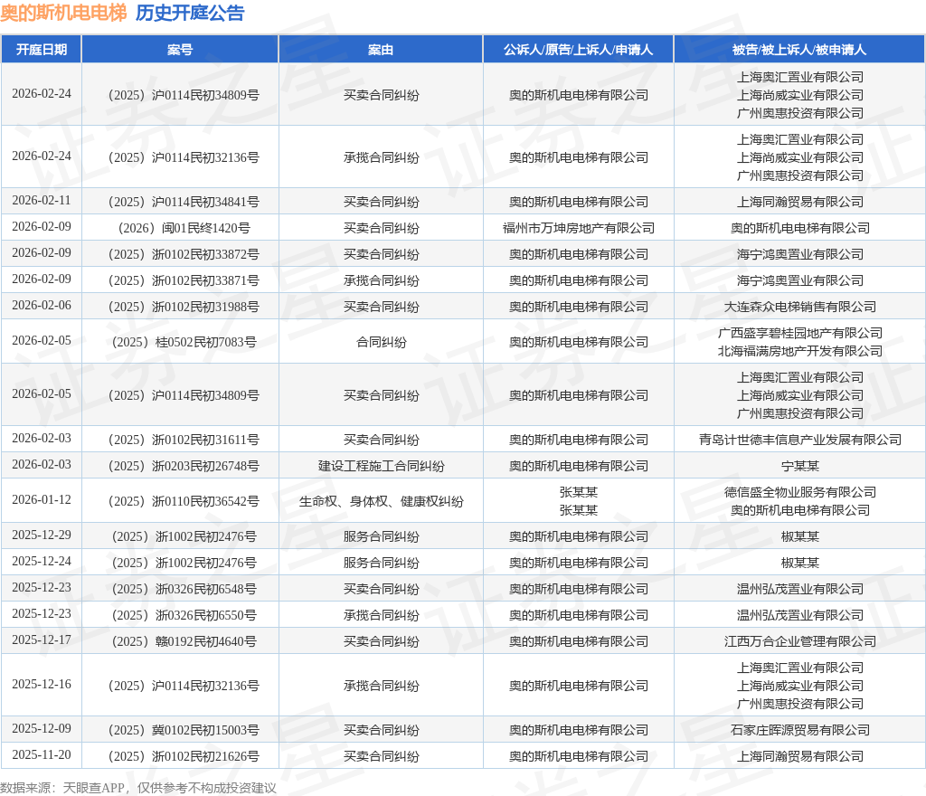 案号:(2025)浙0102民初31988号根据统计,近一年内以奥的斯机电电梯有限公司为当事人的历史开庭公告有208则,其中案由为“买卖合同纠纷”的公告以90则居首,其次为“承揽合同纠纷”有60则,“建设工程施工合同纠纷”有13则。历史开庭公告(前20条)如下: