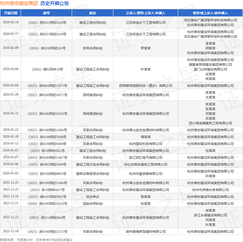 案号:(2026)闽02民申18号根据统计,近一年内以杭州萧宏建设环境集团有限公司为当事人的历史开庭公告有81则,其中案由为“建设工程施工合同纠纷”的公告以15则居首,其次为“买卖合同纠纷”有14则,“建设工程分包合同纠纷”有9则。历史开庭公告(前20条)如下: