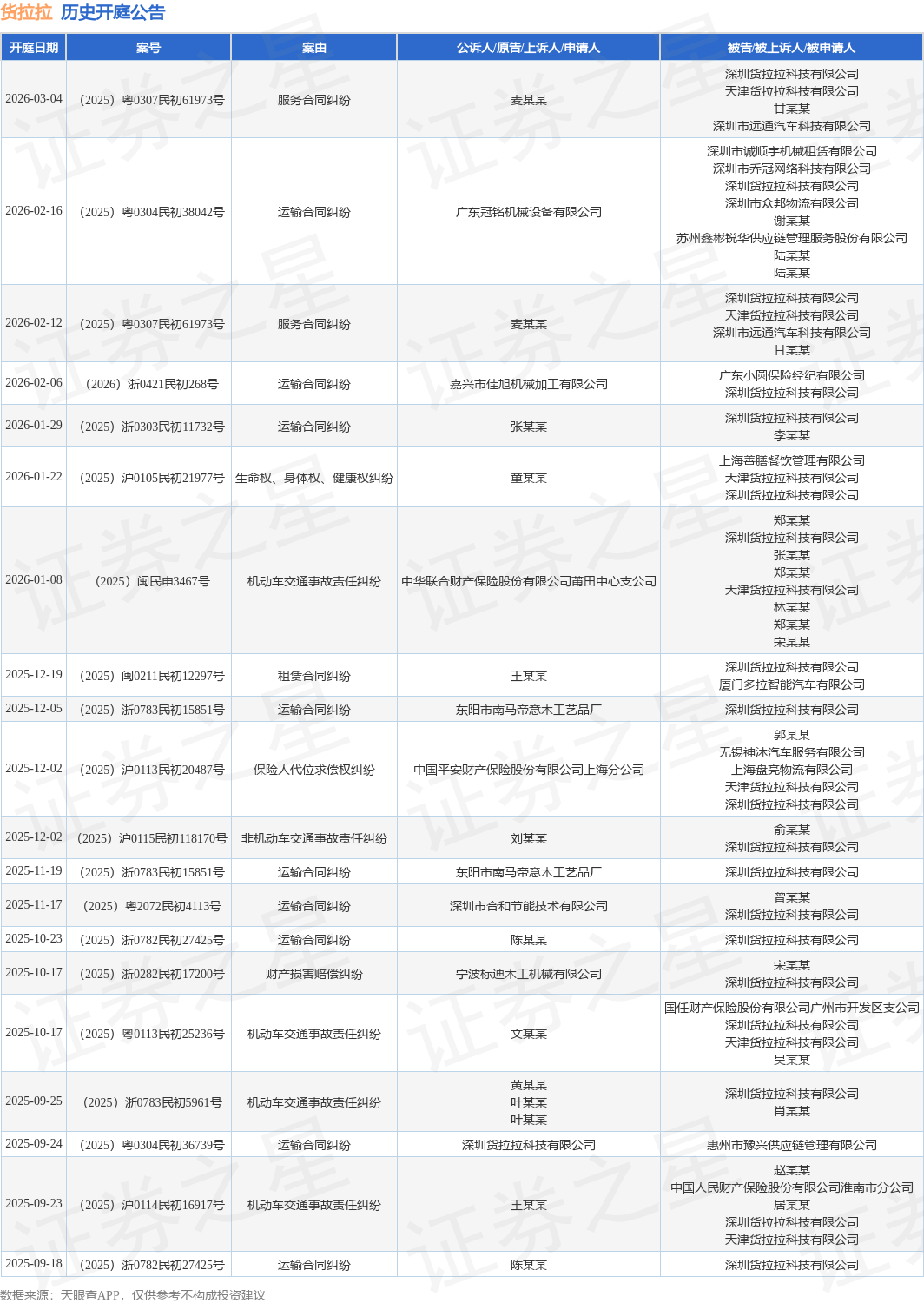 案号:(2026)浙0421民初268号根据统计,近一年内以深圳货拉拉科技有限公司为当事人的历史开庭公告有70则,其中案由为“运输合同纠纷”的公告以21则居首,其次为“机动车交通事故责任纠纷”有17则,“生命权、身体权、健康权纠纷”有7则。历史开庭公告(前20条)如下: