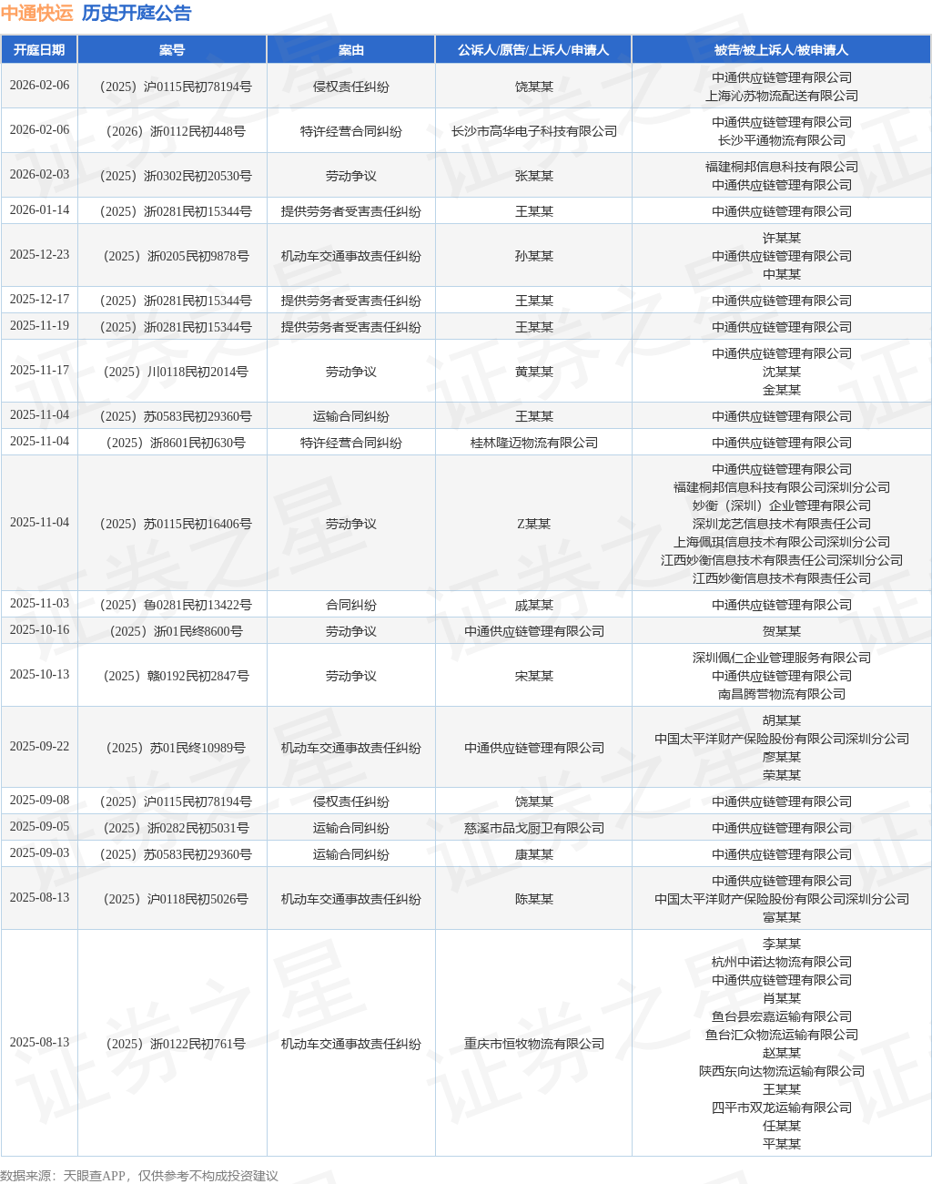 案号:(2025)沪0115民初78194号根据统计,近一年内以中通供应链管理有限公司为当事人的历史开庭公告有41则,其中案由为“运输合同纠纷”的公告以10则居首,其次为“劳动争议”有9则,“机动车交通事故责任纠纷”有9则。历史开庭公告(前20条)如下: