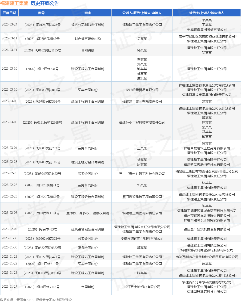 案号:(2026)闽01民终1131号根据统计,近一年内以福建建工集团有限责任公司为当事人的历史开庭公告有171则,其中案由为“建设工程施工合同纠纷”的公告以63则居首,其次为“买卖合同纠纷”有20则,“建设工程分包合同纠纷”有16则。历史开庭公告(前20条)如下: