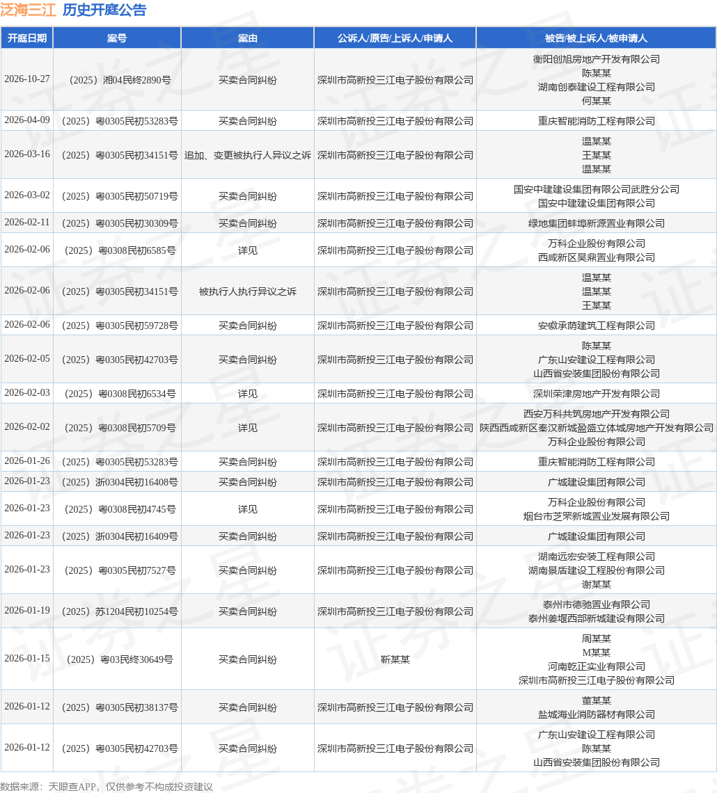 案号:(2025)粤0305民初34151号根据统计,近一年内以深圳市高新投三江电子股份有限公司为当事人的历史开庭公告有234则,其中案由为“买卖合同纠纷”的公告以218则居首,其次为“详见”有5则,“侵害发明专利权纠纷”有3则。历史开庭公告(前20条)如下: