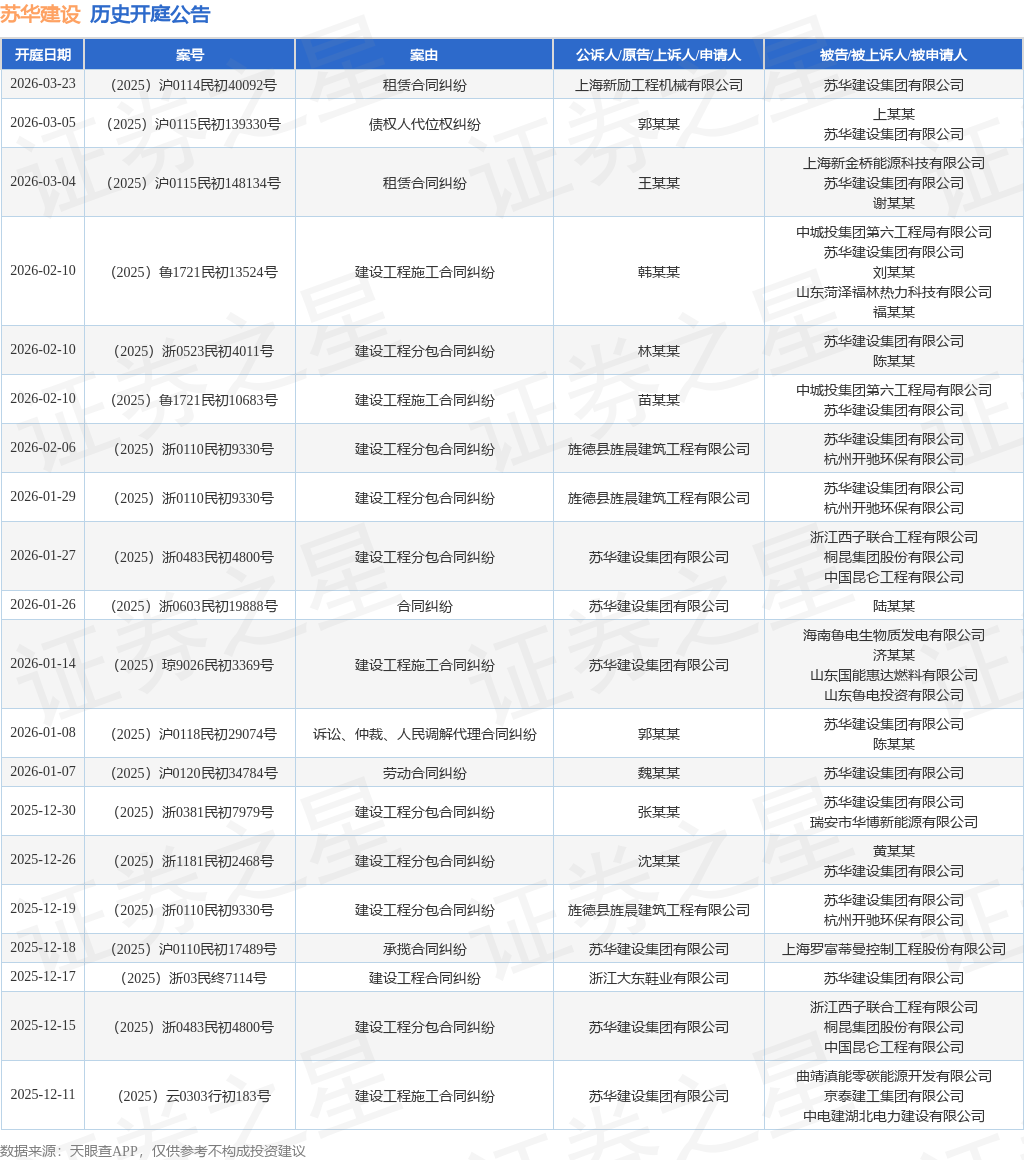 案号:(2025)浙0110民初9330号根据统计,近一年内以苏华建设集团有限公司为当事人的历史开庭公告有156则,其中案由为“建设工程施工合同纠纷”的公告以29则居首,其次为“买卖合同纠纷”有27则,“建设工程分包合同纠纷”有16则。历史开庭公告(前20条)如下: