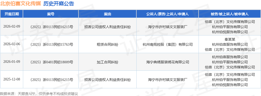案号:(2025)浙0113民初15763号根据统计,近一年内以伯喜(北京)文化传媒有限公司为当事人的历史开庭公告有4则,其中案由为“损害公司债权人利益责任纠纷”的公告以2则居首,其次为“加工合同纠纷”有1则,“租赁合同纠纷”有1则。历史开庭公告如下: