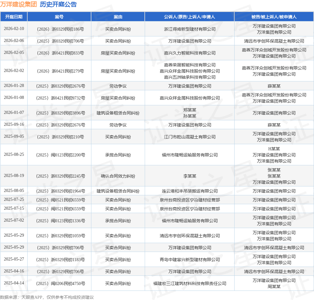 案号:(2025)浙0329民初706号根据统计,近一年内以万洋建设集团有限公司为当事人的历史开庭公告有22则,其中案由为“买卖合同纠纷”的公告以12则居首,其次为“房屋买卖合同纠纷”有3则,“劳动争议”有2则。历史开庭公告(前20条)如下: