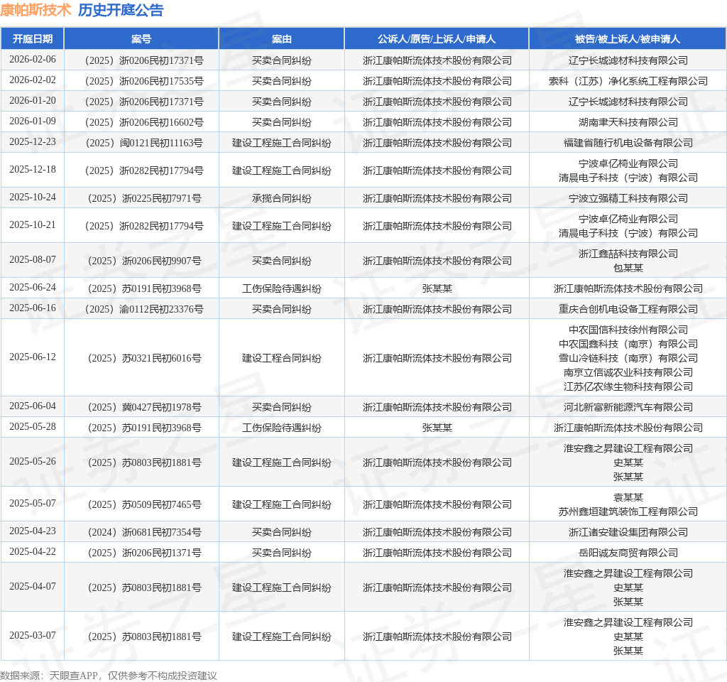 案号:(2025)浙0206民初17371号根据统计,近一年内以浙江康帕斯流体技术股份有限公司为当事人的历史开庭公告有20则,其中案由为“买卖合同纠纷”的公告以9则居首,其次为“建设工程施工合同纠纷”有7则,“工伤保险待遇纠纷”有2则。历史开庭公告如下: