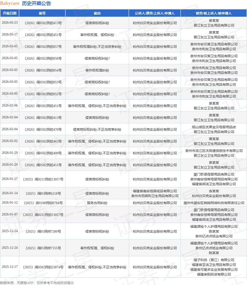 案号:(2026)闽0582民初451号根据统计,近一年内以杭州白贝壳实业股份有限公司为当事人的历史开庭公告有86则,其中案由为“侵害商标权纠纷”的公告以28则居首,其次为“著作权权属、侵权纠纷”有22则,“著作权权属、侵权纠纷,不正当竞争纠纷”有10则。历史开庭公告(前20条)如下: