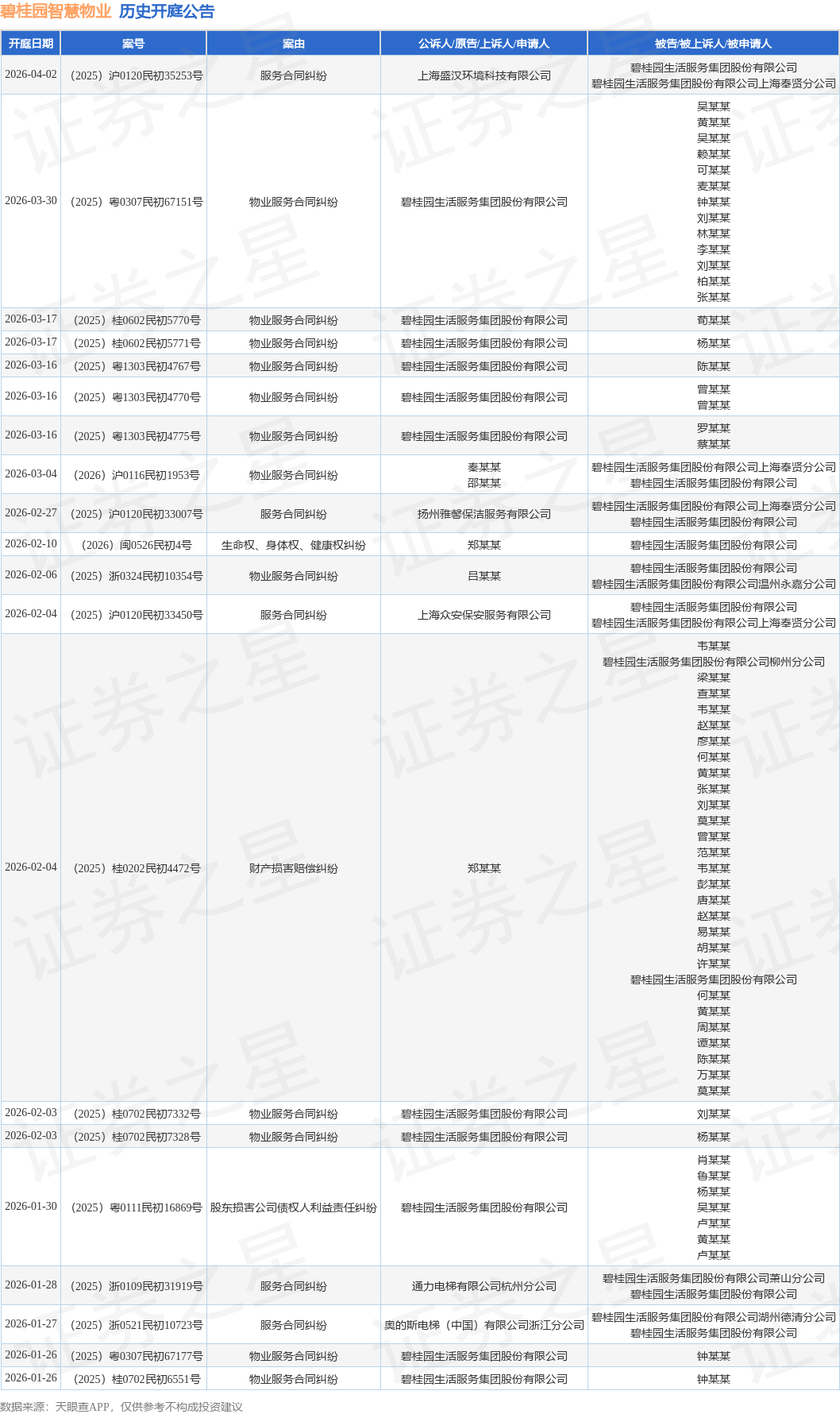 案号:(2025)浙0324民初10354号根据统计,近一年内以碧桂园生活服务集团股份有限公司为当事人的历史开庭公告有68则,其中案由为“物业服务合同纠纷”的公告以32则居首,其次为“服务合同纠纷”有22则,“违反安全保障义务责任纠纷”有3则。历史开庭公告(前20条)如下: