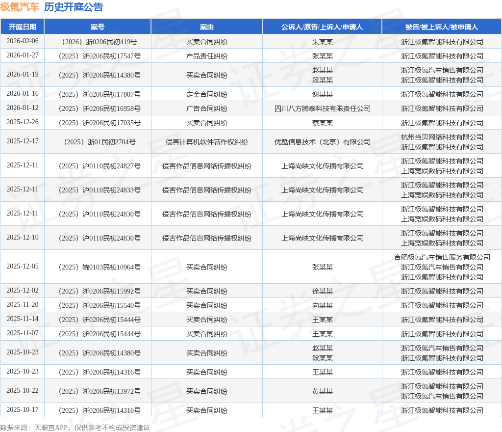 案号:(2026)浙0206民初419号根据统计,近一年内以浙江极氪智能科技有限公司为当事人的历史开庭公告有58则,其中案由为“买卖合同纠纷”的公告以32则居首,其次为“装饰装修合同纠纷”有7则,“侵害作品信息网络传播权纠纷”有4则。历史开庭公告(前20条)如下:
