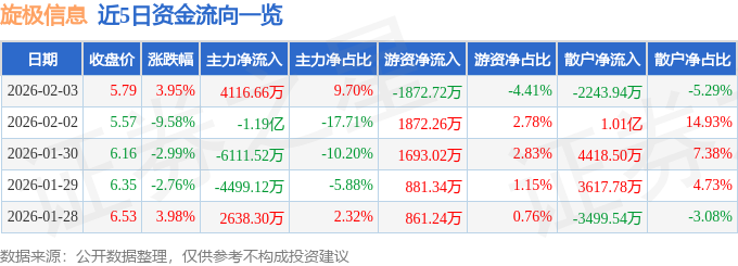 证券之星消息,截至2026年2月3日收盘,旋极信息(300324)报收于5.79元,上涨3.95%,换手率4.35%,成交量74.42万手,成交额4.25亿元。