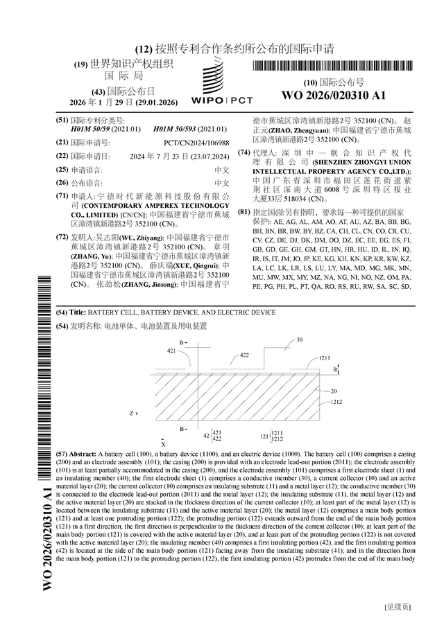 证券之星消息,根据企查查数据显示宁德时代(300750)公布了一项国际专利申请,专利名为“电池单体、电池装置及用电装置”,专利申请号为PCT/CN2024/106988,国际公布日为2026年1月29日。