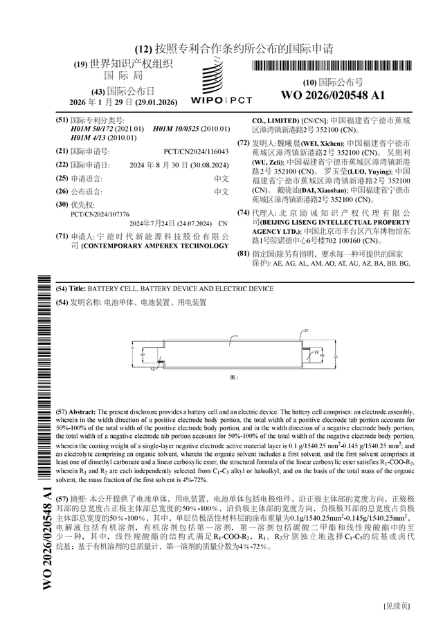 证券之星消息,根据企查查数据显示宁德时代(300750)公布了一项国际专利申请,专利名为“电池单体、电池装置、用电装置”,专利申请号为PCT/CN2024/116043,国际公布日为2026年1月29日。