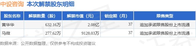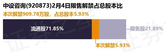 证券之星消息,根据市场公开信息整理,中设咨询(920873)于2月4日将有909.78万股限售股份解禁,为公司追加承诺限售股份上市流通,占公司总股本5.93%。(本次数据根据历史公告整理得出,实际情况以上市公司最新公告为准)最近一年内,该股累计解禁102.3万股,占总股本的0.67%。本次解禁后,公司还有3358.06万股限售股份,占总股本21.89%。具体如下图所示: