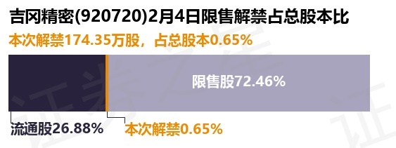 证券之星消息,根据市场公开信息整理,吉冈精密(920720)于2月4日将有174.35万股限售股份解禁,为公司股权激励限售股份,占公司总股本0.65%。(本次数据根据历史公告整理得出,实际情况以上市公司最新公告为准)本次解禁后,公司还有1.93亿股限售股份,占总股本72.46%。具体如下图所示: