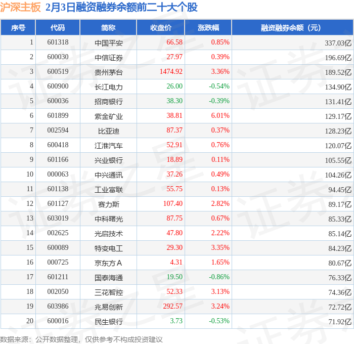 沪深主板融资融券余额前三分别为:中国平安(601318)融资融券余额337.03亿元、中信证券(600030)融资融券余额196.69亿元、贵州茅台(600519)融资融券余额189.52亿元,前20具体见下表: