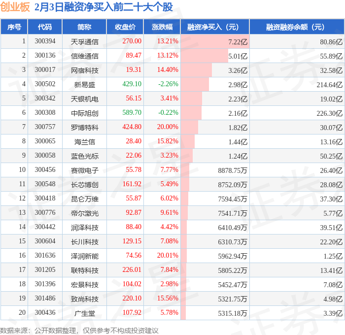 创业板融资净买入前三分别为:天孚通信(300394)融资净买入7.22亿元、信维通信(300136)融资净买入5.01亿元、网宿科技(300017)融资净买入3.26亿元,前20具体见下表: