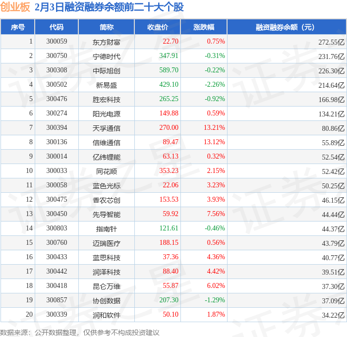 创业板融资融券余额前三分别为:东方财富(300059)融资融券余额272.55亿元、宁德时代(300750)融资融券余额231.76亿元、中际旭创(300308)融资融券余额226.3亿元,前20具体见下表: