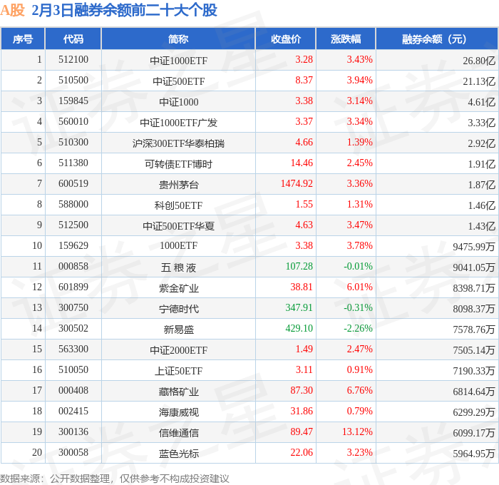 A股融券余额前三分别为:中证1000ETF(512100)融券余额26.8亿元、中证500ETF(510500)融券余额21.13亿元、中证1000(159845)融券余额4.61亿元,前20具体见下表: