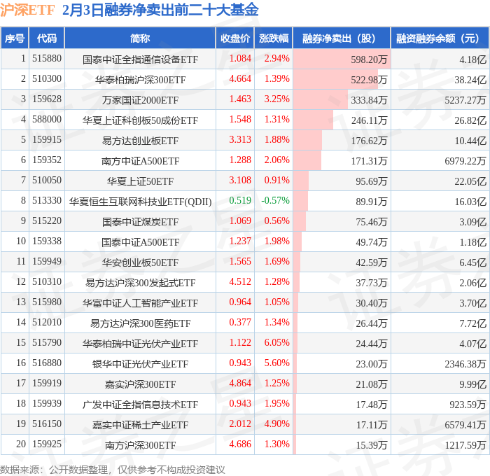 沪深ETF融券净卖出前三分别为:国泰中证全指通信设备ETF(515880)融券净卖出598.2万股、华泰柏瑞沪深300ETF(510300)融券净卖出522.98万股、万家国证2000ETF(159628)融券净卖出333.84万股,前20具体见下表: