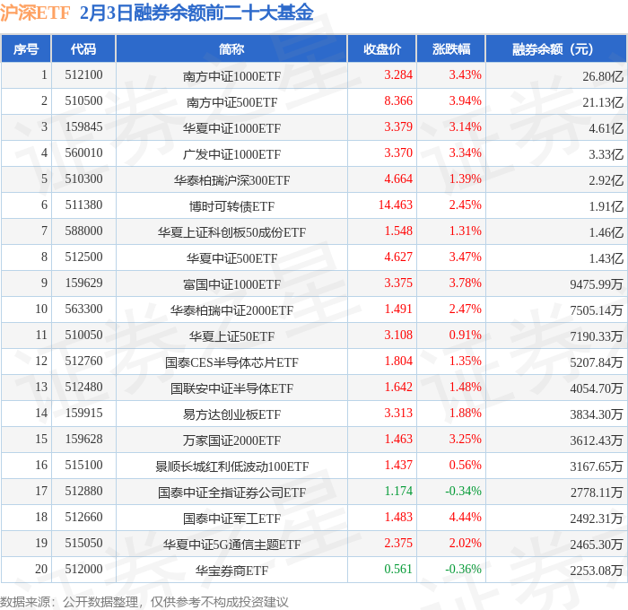 沪深ETF融券余额前三分别为:南方中证1000ETF(512100)融券余额26.8亿元、南方中证500ETF(510500)融券余额21.13亿元、华夏中证1000ETF(159845)融券余额4.61亿元,前20具体见下表: