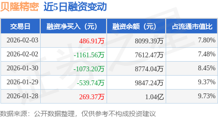 证券之星消息,2月3日,贝隆精密(301567)融资买入891.58万元,融资偿还404.66万元,融资净买入486.91万元,融资余额8099.39万元。