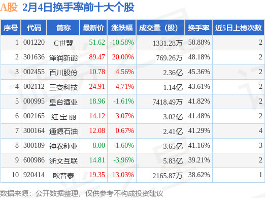 当日A股换手率前10大个股中6只个股收涨,平均涨幅7.67%,其中C世盟(001220)以换手率58.88%排第一,9只个股近5个交易日中多次上榜。