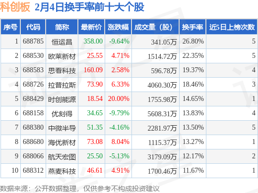 当日科创板换手率前10大个股中6只个股收涨,平均涨幅7.76%,其中恒运昌(688785)以换手率26.8%排第一,7只个股近5个交易日中多次上榜。
