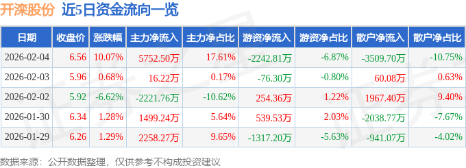 证券之星消息,开滦股份2月4日涨停收盘,收盘价6.56元。该股于14点42分涨停,未打开涨停,截止收盘封单资金为3652.46万元,占其流通市值0.35%。