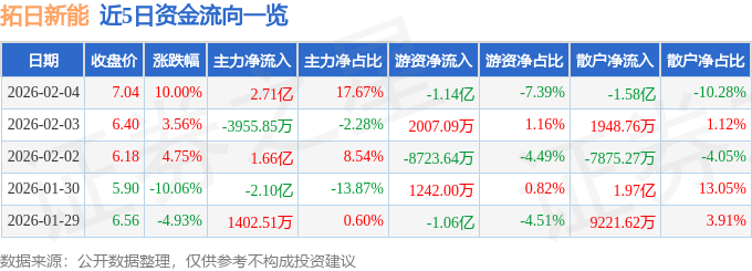 证券之星消息,拓日新能2月4日涨停收盘,收盘价7.04元。该股于10点31分涨停,未打开涨停,截止收盘封单资金为1.15亿元,占其流通市值1.17%。