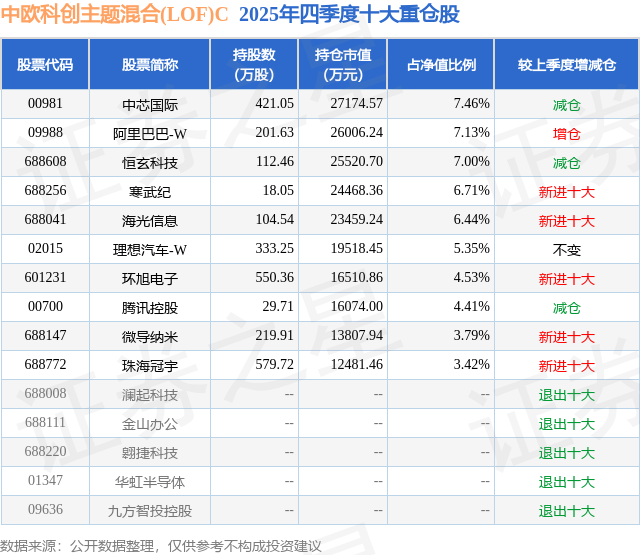 中欧科创主题混合(LOF)C的前十大重仓股如下: