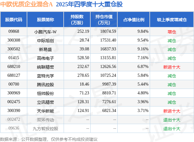 根据2025基金年报公募基金重仓股数据,重仓该股的公募基金共8家,其中持有数量最多的公募基金为中欧基金的中欧优质企业混合A。中欧优质企业混合A目前规模为17.21亿元,最新净值1.3842(2月3日),较上一交易日上涨2.95%,近一年上涨53.87%。该公募基金现任基金经理为代云锋。代云锋在任的基金产品包括:中欧洞见一年持有混合,管理时间为2022年7月7日至今,期间收益率为31.05%;中欧科技成长混合A,管理时间为2024年2月2日至今,期间收益率为108.71%。