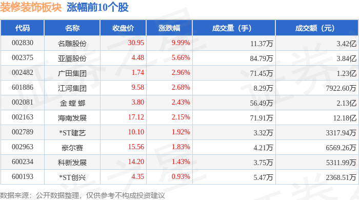 证券之星消息,2月4日装修装饰板块较上一交易日上涨0.97%,名雕股份领涨。当日上证指数报收于4102.2,上涨0.85%。深证成指报收于14156.27,上涨0.21%。装修装饰板块个股涨跌见下表: