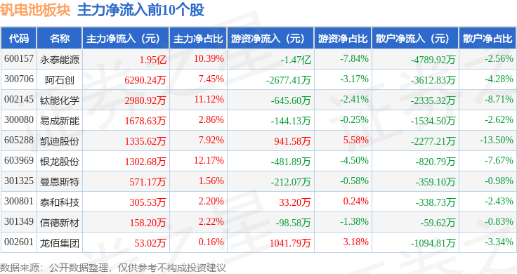 从资金流向上来看,当日钒电池板块主力资金净流入2383.5万元,游资资金净流出8507.53万元,散户资金净流入6124.04万元。钒电池板块个股资金流向见下表: