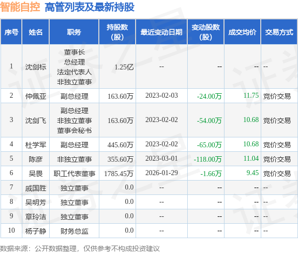 智能自控的高管列表及最新持股情况如下: