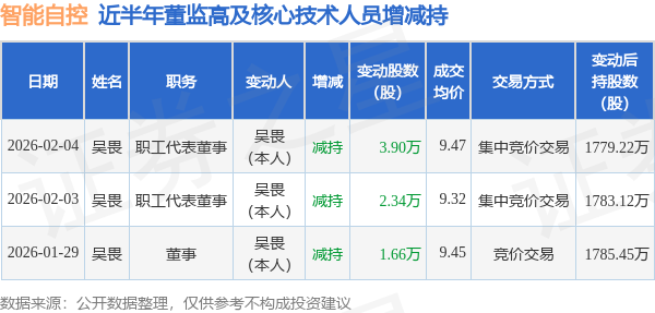 证券之星消息,根据2月4日市场公开信息、上市公司公告及交易所披露数据整理,智能自控(002877)最新董监高及相关人员股份变动情况:2026年2月3日至2026年2月4日公司职工代表董事吴畏共减持公司股份6.24万股,占公司总股本为0.0176%。变动期间公司股价上涨1.84%,2月3日当日收盘报9.41元。