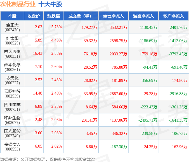 个股表现方面,农化制品行业当日领涨股为金正大(002470),该股当日报收2.03,上涨5.73%,成交量179.27万,主力资金净流入3532.21万元。红太阳(000525)以上涨4.43%紧随其后,该股当日成交量39.32万,主力资金净流入2598.75万元。除此之外,宏达股份(600331)、雅本化学(300261)、赤天化(600227)均进入当日牛股之列。具体个股列表见下表: