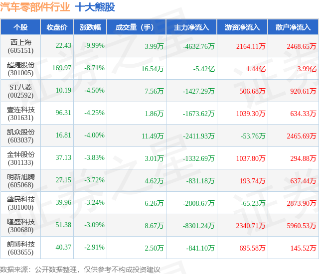 个股表现方面,汽车零部件行业当日领跌股为西上海(605151),该股当日报收22.43,下跌9.99%,成交量3.99万,主力资金净流出4632.76万元。超捷股份(301005)以下跌8.71%紧随其后,该股当日成交量16.54万,主力资金净流出5.42亿元。除此之外,ST八菱(002592)、壹连科技(301631)、凯众股份(603037)均进入当日熊股之列。具体个股列表见下表:
