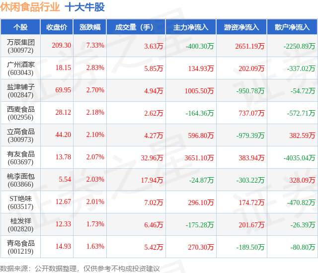 个股表现方面,休闲食品行业当日领涨股为万辰集团(300972),该股当日报收209.3,上涨7.33%,成交量3.63万,主力资金净流出400.3万元。广州酒家(603043)以上涨2.83%紧随其后,该股当日成交量5.85万,主力资金净流入134.93万元。除此之外,盐津铺子(002847)、西麦食品(002956)、立高食品(300973)均进入当日牛股之列。具体个股列表见下表: