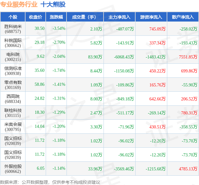 个股表现方面,专业服务行业当日领跌股为胜科纳米(688757),该股当日报收30.5,下跌3.54%,成交量2.1万,主力资金净流出487.07万元。科锐国际(300662)以下跌2.7%紧随其后,该股当日成交量5.82万,主力资金净流出143.91万元。除此之外,电科院(300215)、信测标准(300938)、零点有数(301169)均进入当日熊股之列。具体个股列表见下表: