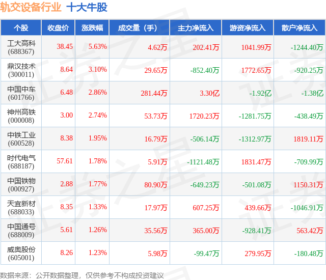 个股表现方面,轨交设备行业当日领涨股为工大高科(688367),该股当日报收38.45,上涨5.63%,成交量4.62万,主力资金净流入202.41万元。鼎汉技术(300011)以上涨3.1%紧随其后,该股当日成交量29.65万,主力资金净流出852.4万元。除此之外,中国中车(601766)、神州高铁(000008)、中铁工业(600528)均进入当日牛股之列。具体个股列表见下表: