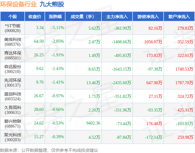 个股表现方面,环保设备行业当日领跌股为*ST节能(000820),该股当日报收3.34,下跌5.11%,成交量5.62万,主力资金净流出361.99万元。美埃科技(688376)以下跌2.05%紧随其后,该股当日成交量2.47万,主力资金净流出1408.66万元。除此之外,青达环保(688501)、森远股份(300210)、先河环保(300137)均进入当日熊股之列。具体个股列表见下表: